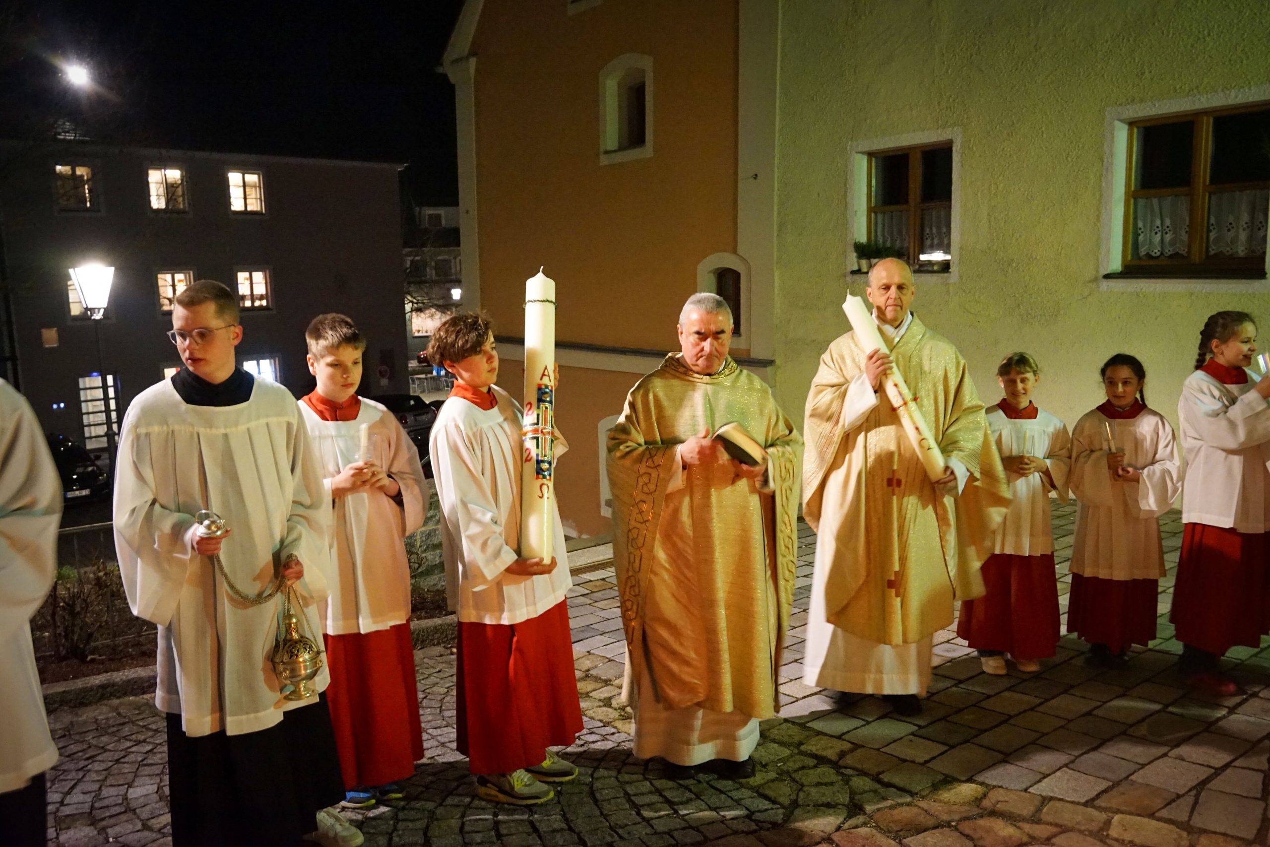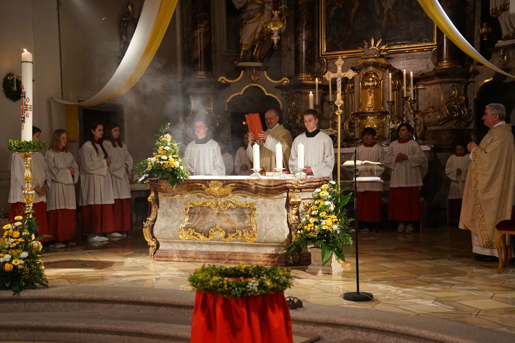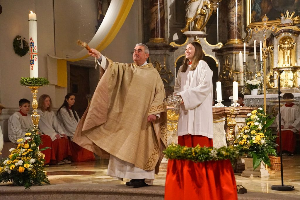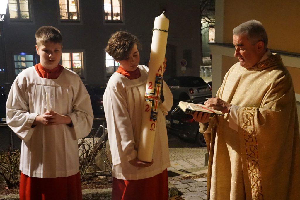 Vor der Kirche St. Johannes der Täufer in Oberviechtach wurde das Osterfeuer entzündet und die Osterkerze gesegnet. Mit dem feierlichen Ruf „Lumen Christi“ trugen Pfarrer Alfons Kaufmann, Pfarrer Thomas Hösl und unsere Ministranten das Licht in die dunkle Kirche und bald leuchtete die Kirche im warmen Schein unzähliger Kerzen.