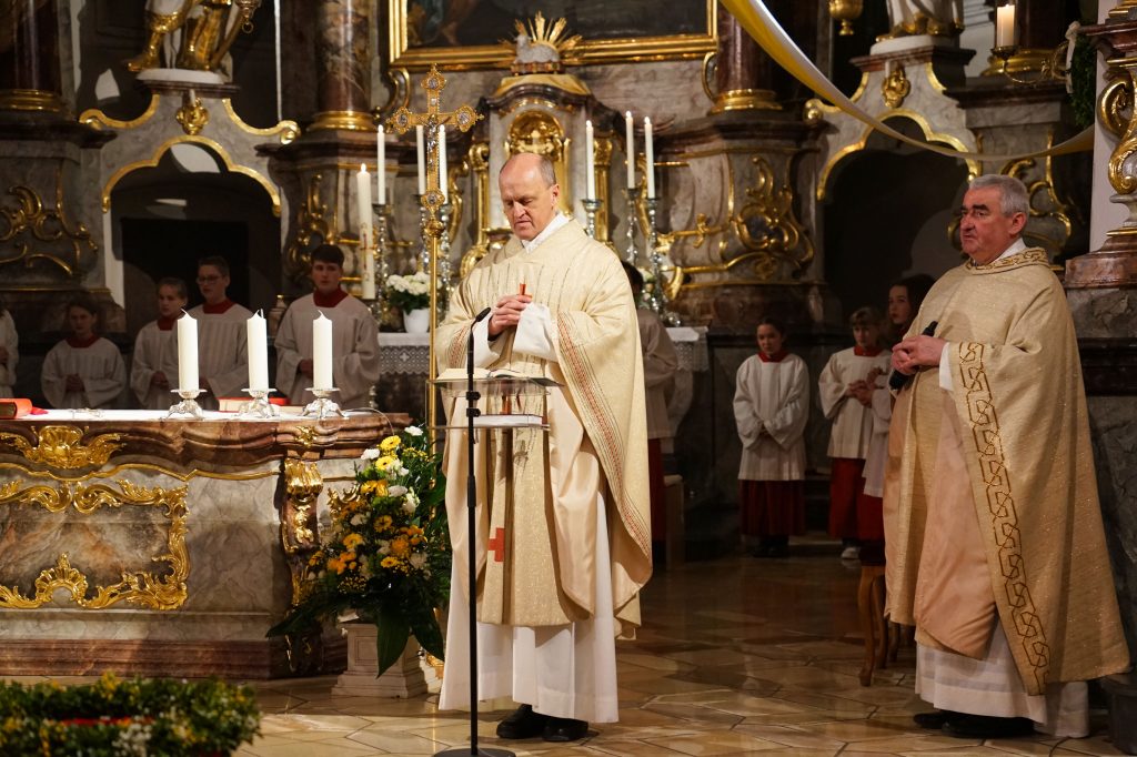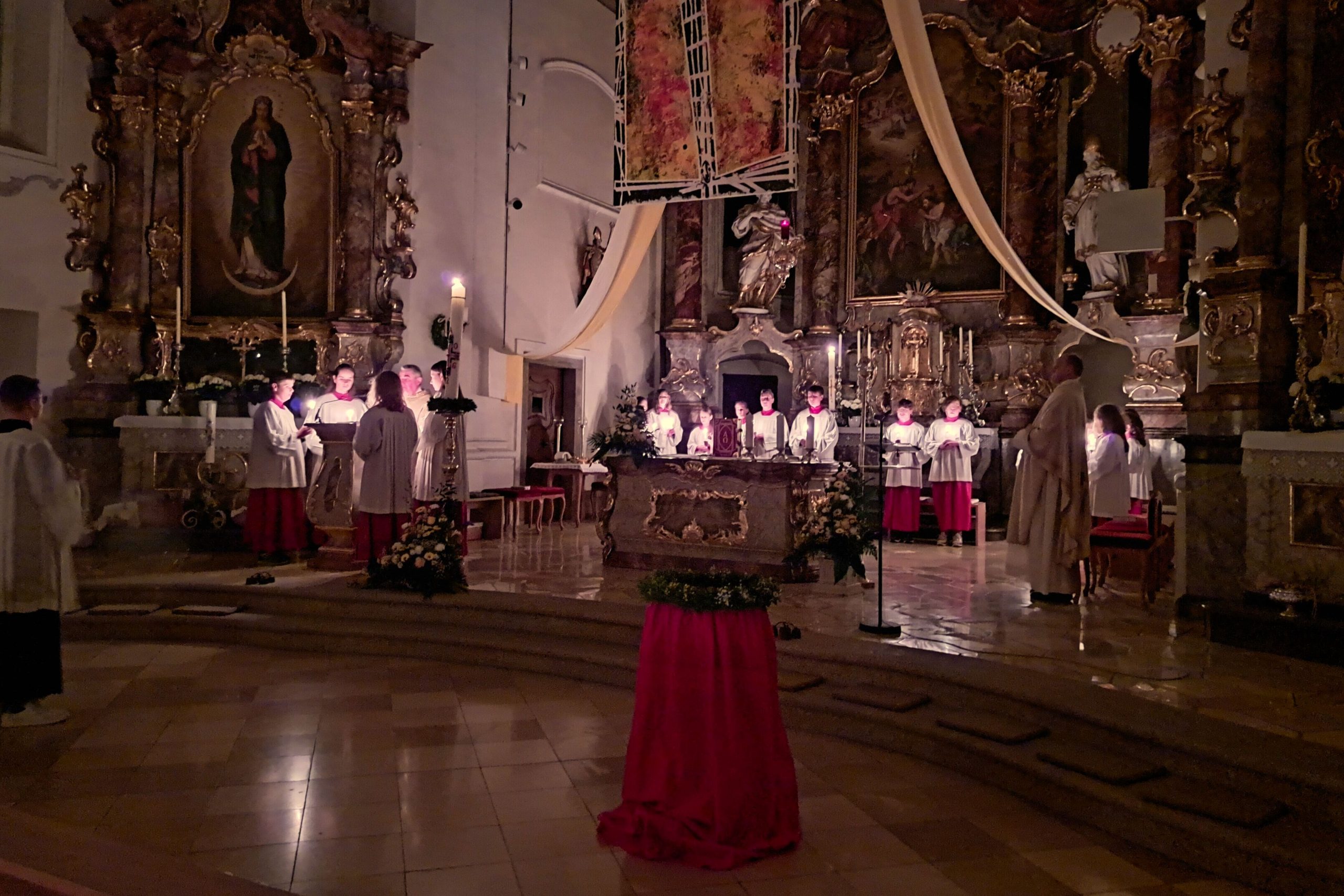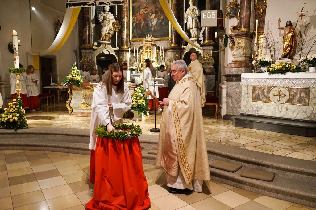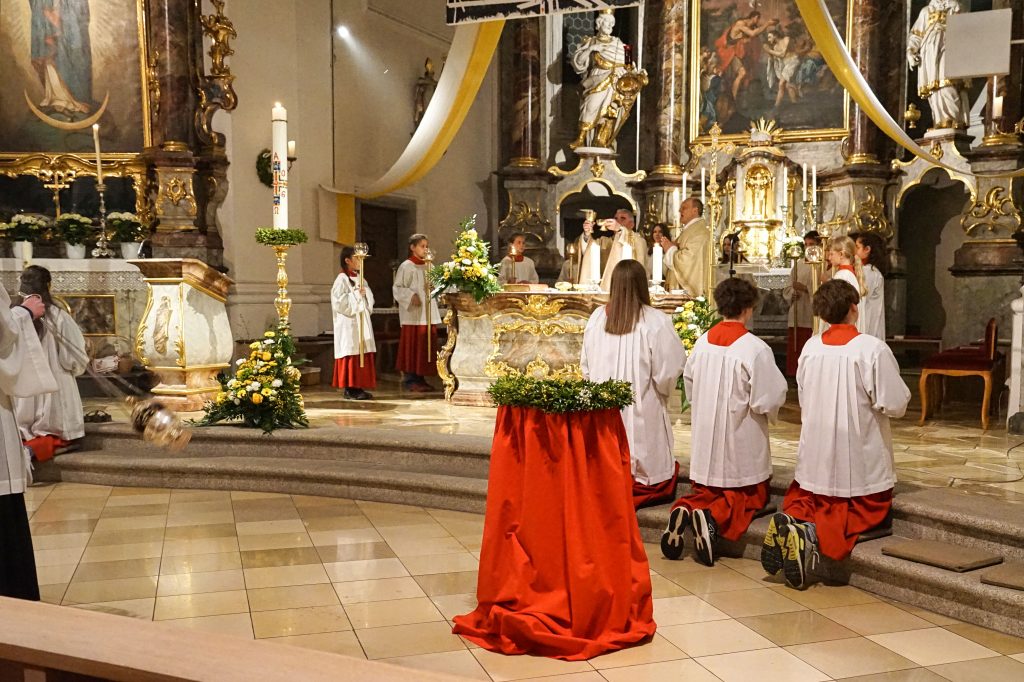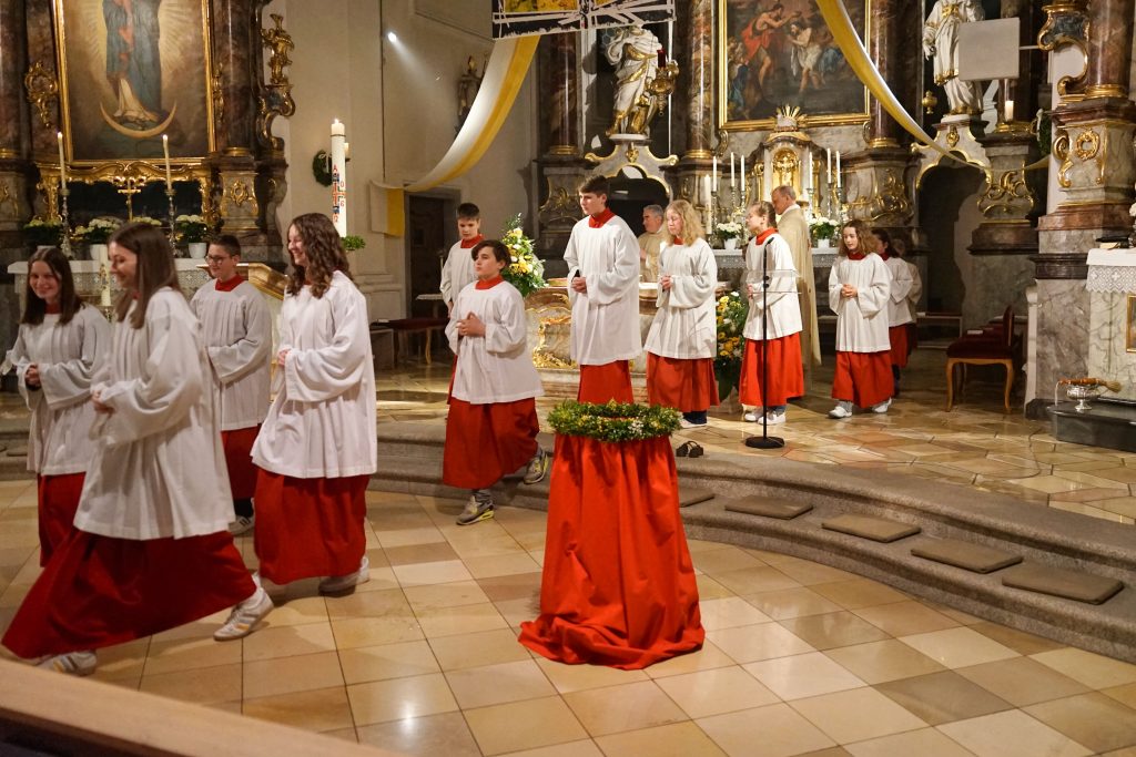 Vor der Kirche St. Johannes der Täufer in Oberviechtach wurde das Osterfeuer entzündet und die Osterkerze gesegnet. Mit dem feierlichen Ruf „Lumen Christi“ trugen Pfarrer Alfons Kaufmann, Pfarrer Thomas Hösl und unsere Ministranten das Licht in die dunkle Kirche und bald leuchtete die Kirche im warmen Schein unzähliger Kerzen.