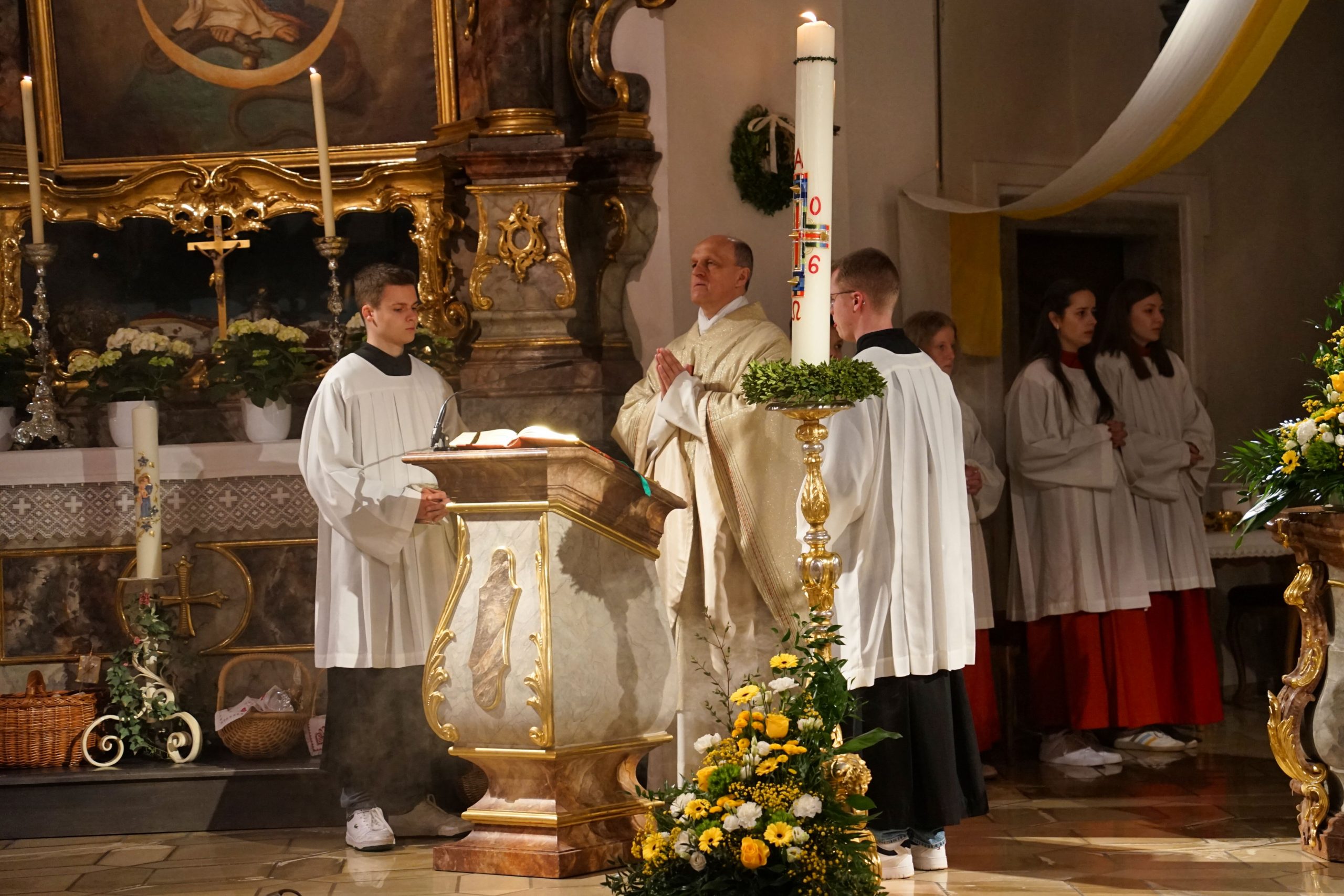 Die Lektoren trugen die Lesungen von der Schöpfung der Welt und dem Durchzug durchs Rote Meer vor, bevor im Osterevangelium die Auferstehung Jesu verkündet wurde. Während des Gottesdienstes wurde auch das Taufwasser geweiht und am Ende der Feier wurden die Osterspeisen gesegnet.